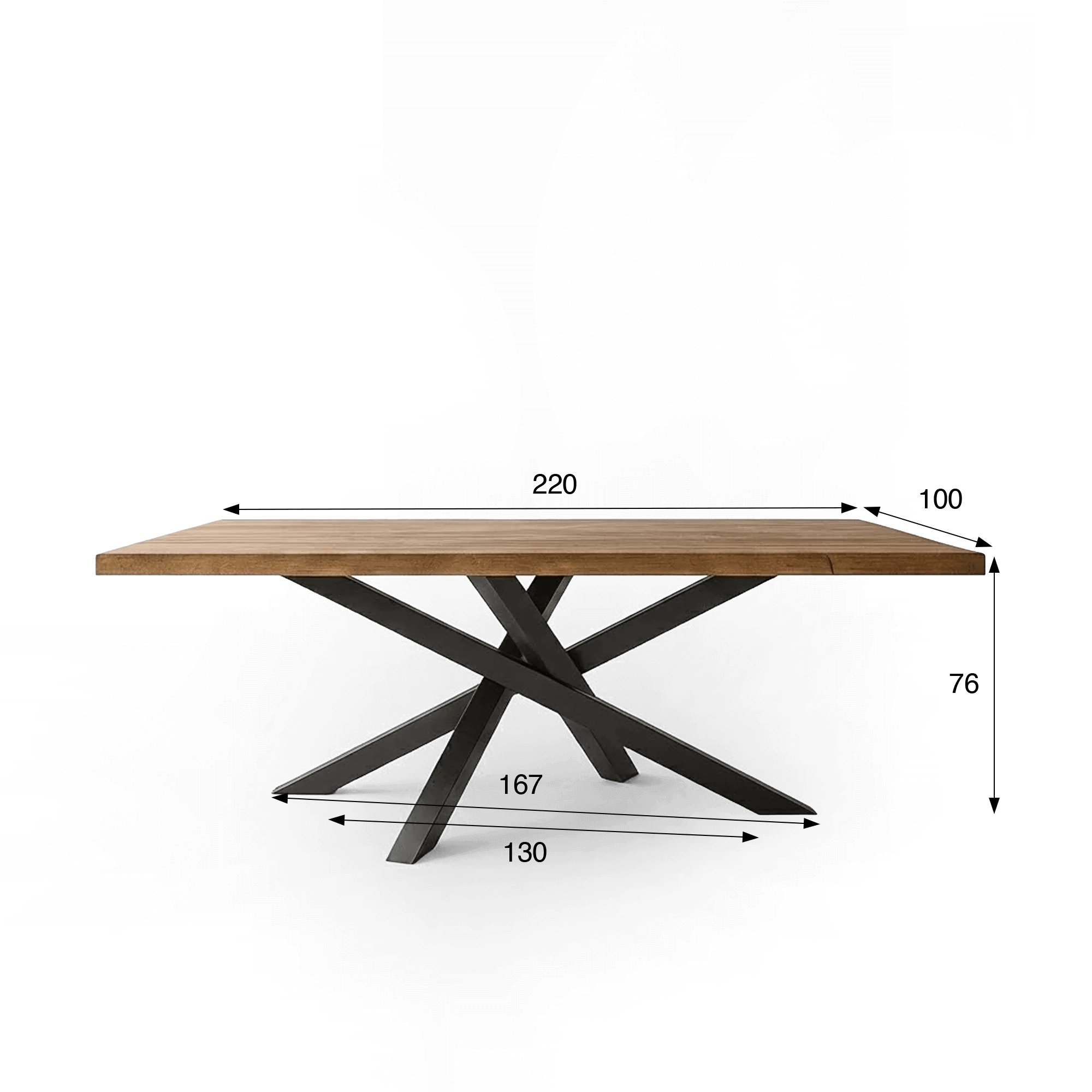 Notre table de salle à manger en bois massif à pied mikado en métal existe en plusieurs longueur de plateau (de 180 cm à 220 cm) sur 100cm de large et 76cm de hauteur, offrant amplement d'espace pour accueillir vos repas, vos réunions familiales ou vos soirées entre amis. L'épaisseur du plateau est de 4cm.