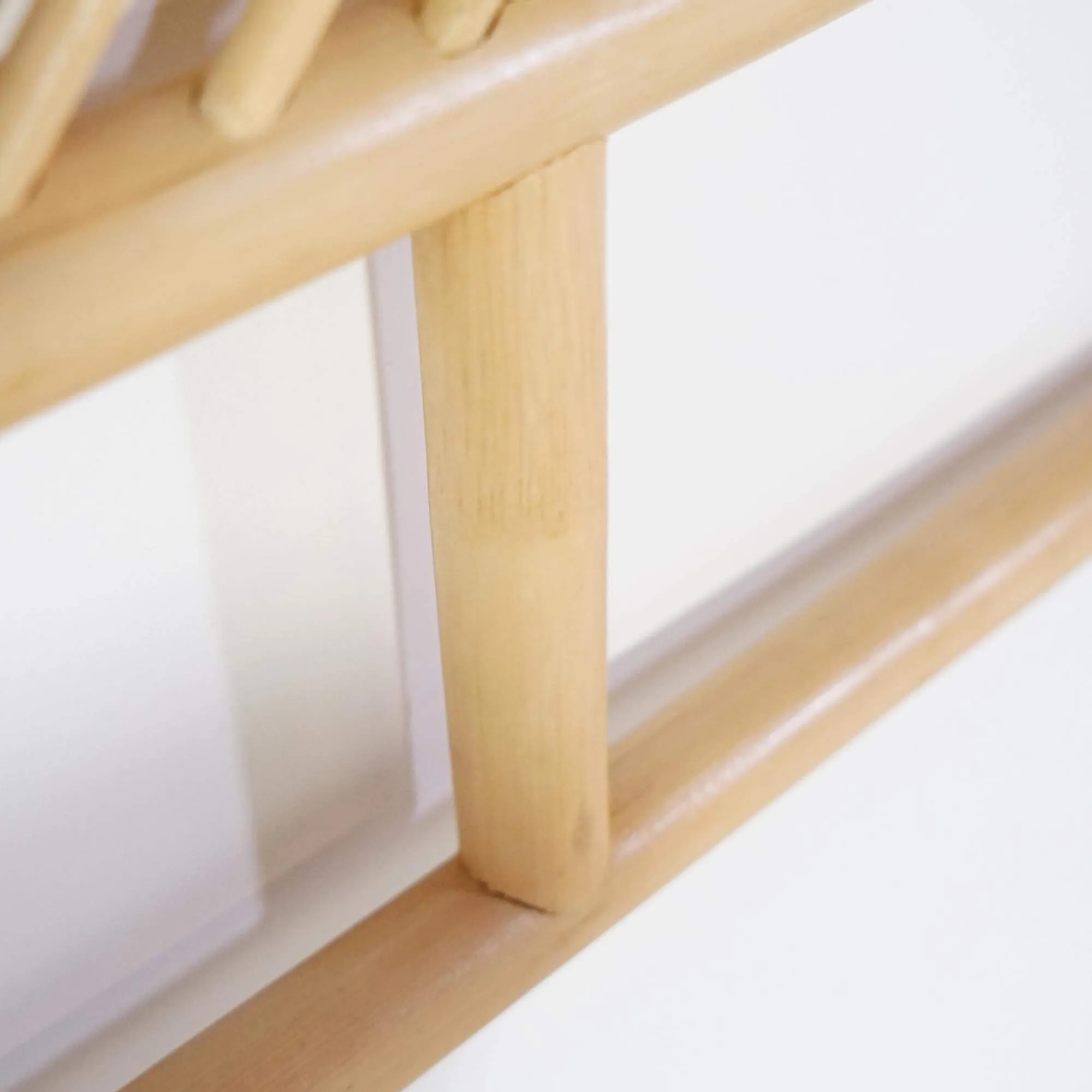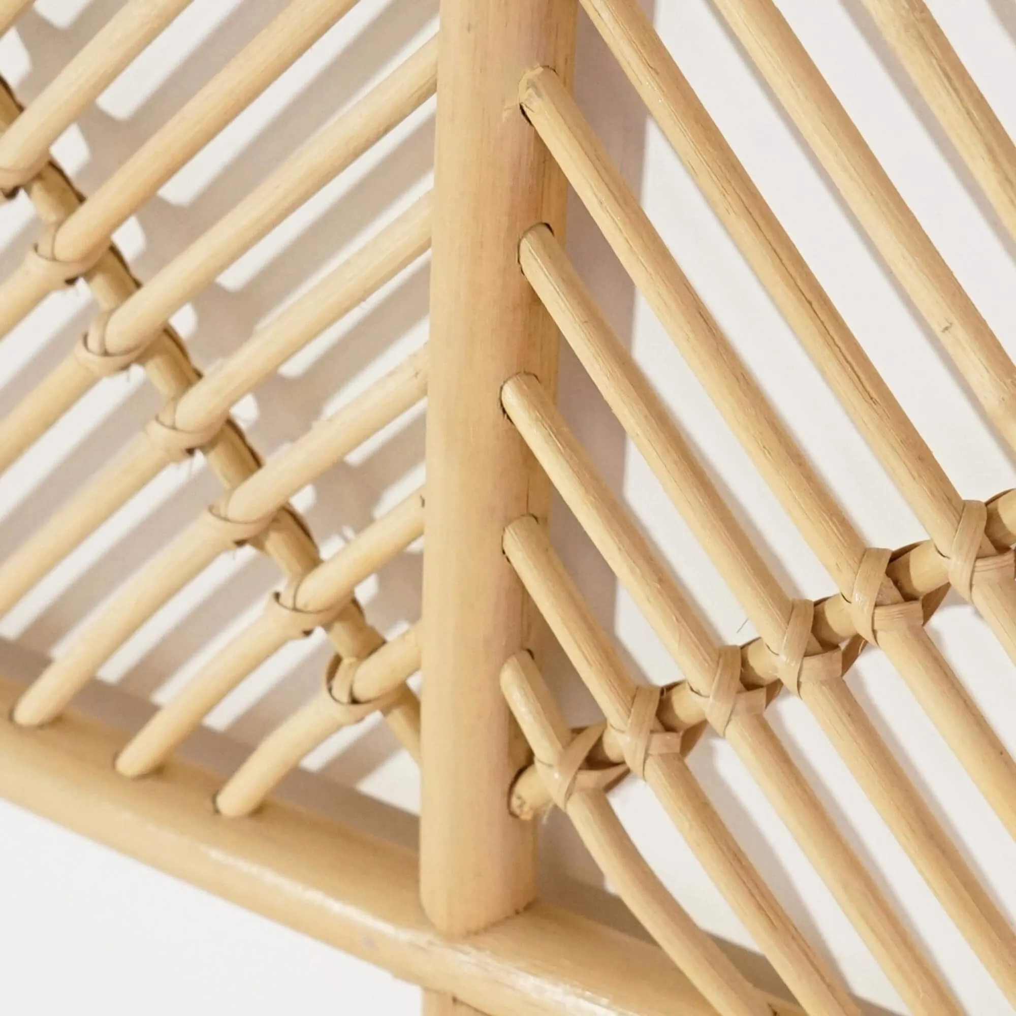 Nous avons imaginé la tête de lit 160 cm en osier (rotin) Weava comme une pièce qui installe immédiatement une atmosphère douce et accueillante dans la chambre. Son dessin s’appuie sur un travail de rotin minutieux, façonné à la main, où chaque tige est courbée, ajustée et assemblée avec précision. Le motif géométrique en diagonale crée un rythme visuel subtil, capable de structurer l’espace tout en laissant circuler la lumière.