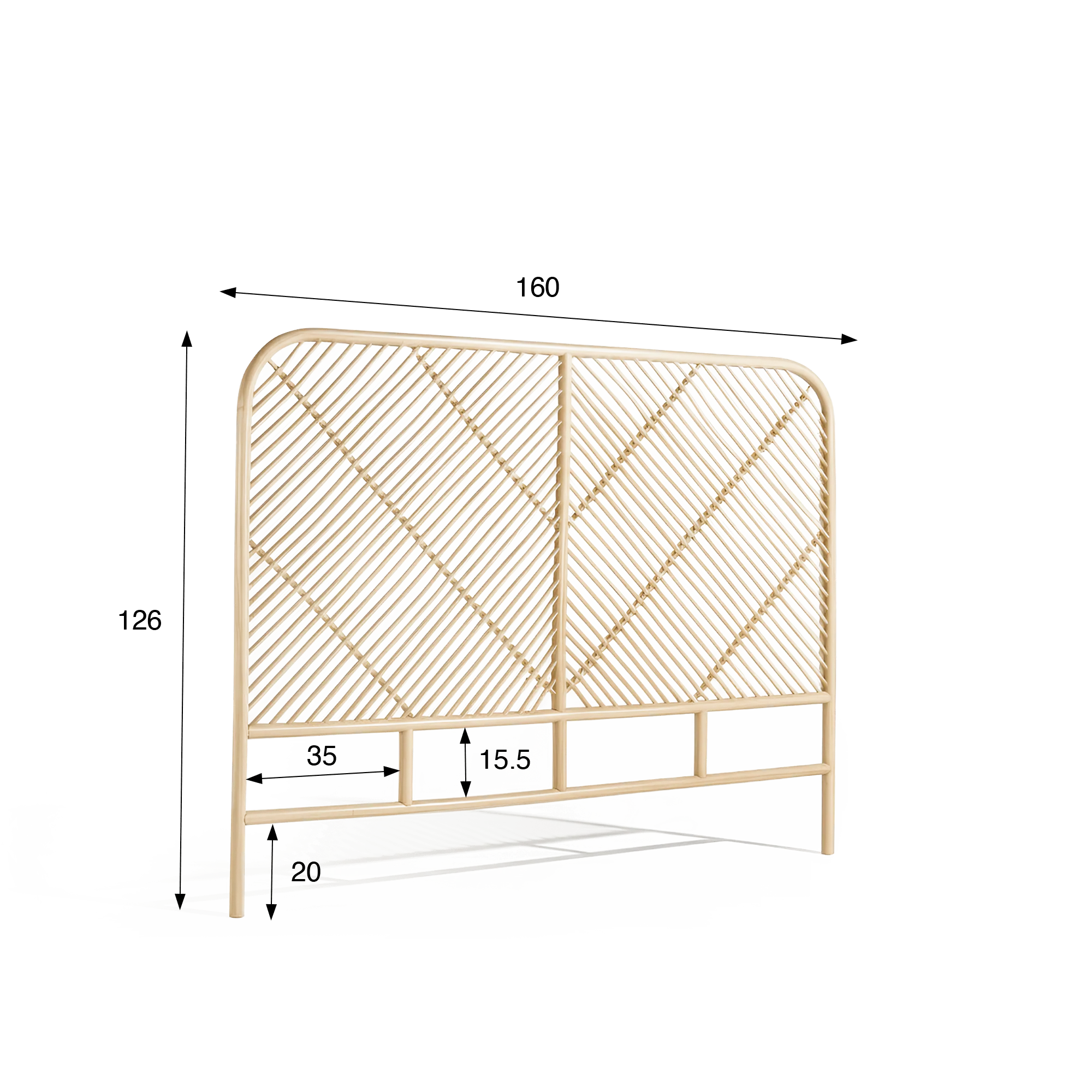 Avec sa largeur de 160 cm, la tête de lit 160 cm en osier (rotin) Weava s’adapte naturellement à un lit double standard et trouve sa place aussi bien dans une chambre épurée que dans un univers plus bohème. Sa hauteur de 126 cm offre un appui confortable pour les moments de lecture ou de détente, tout en dessinant une ligne élégante au mur. La partie inférieure, légèrement surélevée du sol sur près de 20 cm, allège la silhouette et facilite l’intégration avec différents types de sommiers et de linge de lit.