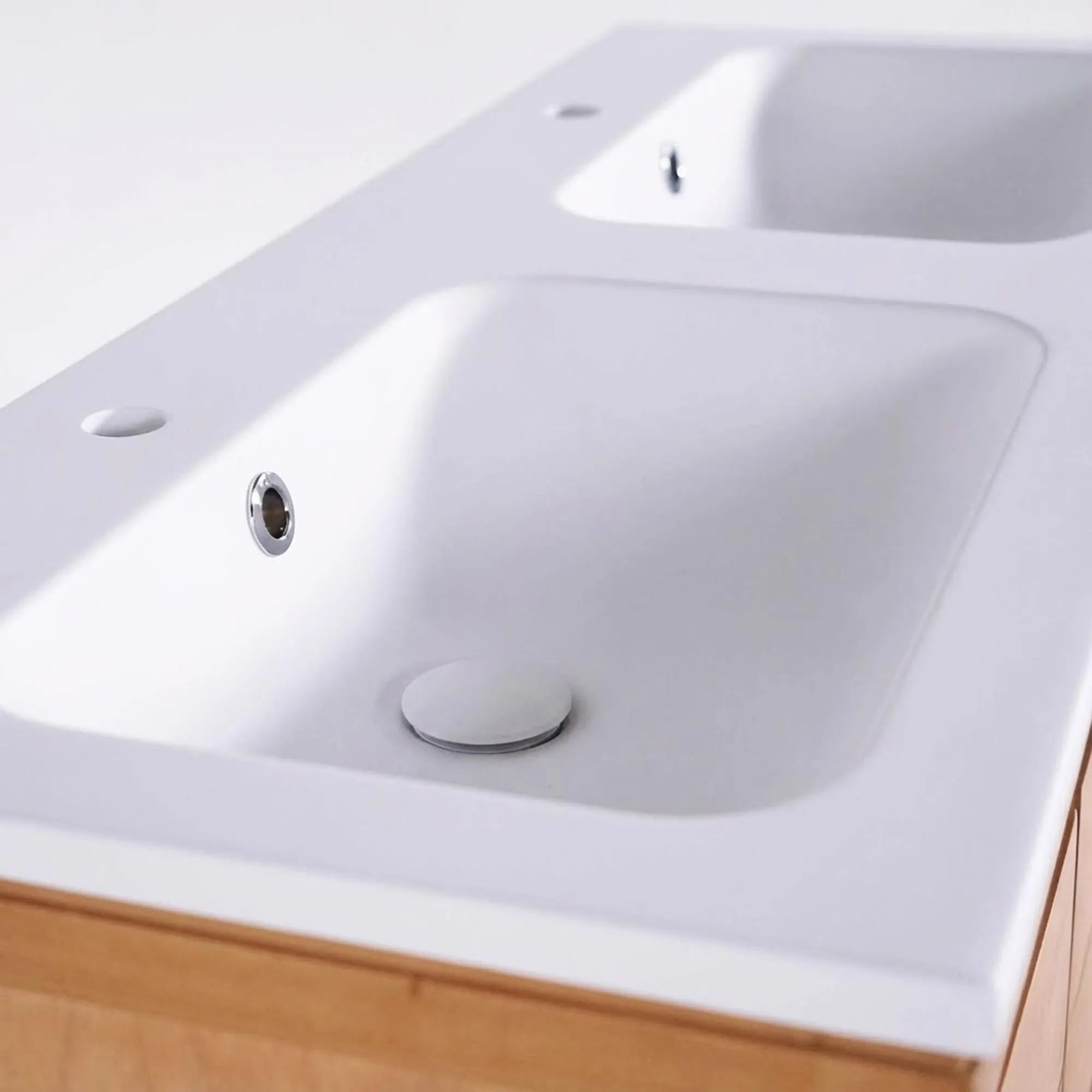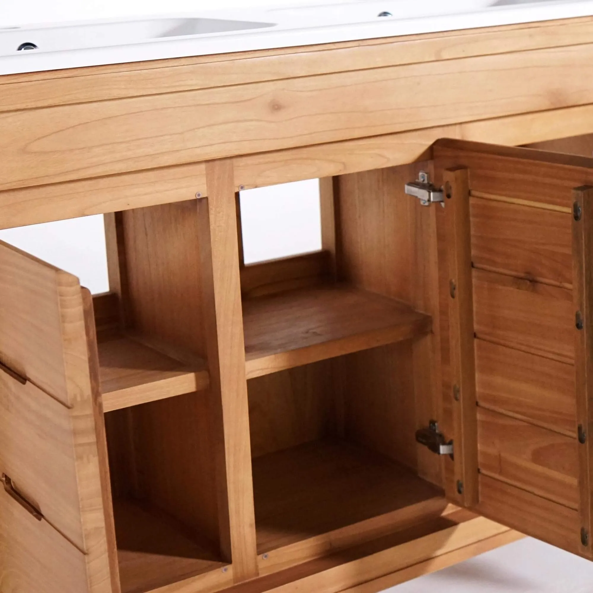 Réalisé en bois massif de mindi, soigneusement sélectionné pour sa stabilité et son grain délicat, ce meuble de salle de bain double vasque en bois massif, blanc mat, révèle une texture chaleureuse au toucher et une teinte naturelle qui capte subtilement la lumière. Chaque panneau, chaque assemblage témoigne d’un travail artisanal précis, que nous avons voulu visible mais discret. Le plateau en céramique blanc mat, destiné à accueillir deux vasques, apporte un contraste lumineux et renforce l’impression de calme et de clarté propre aux intérieurs contemporains.