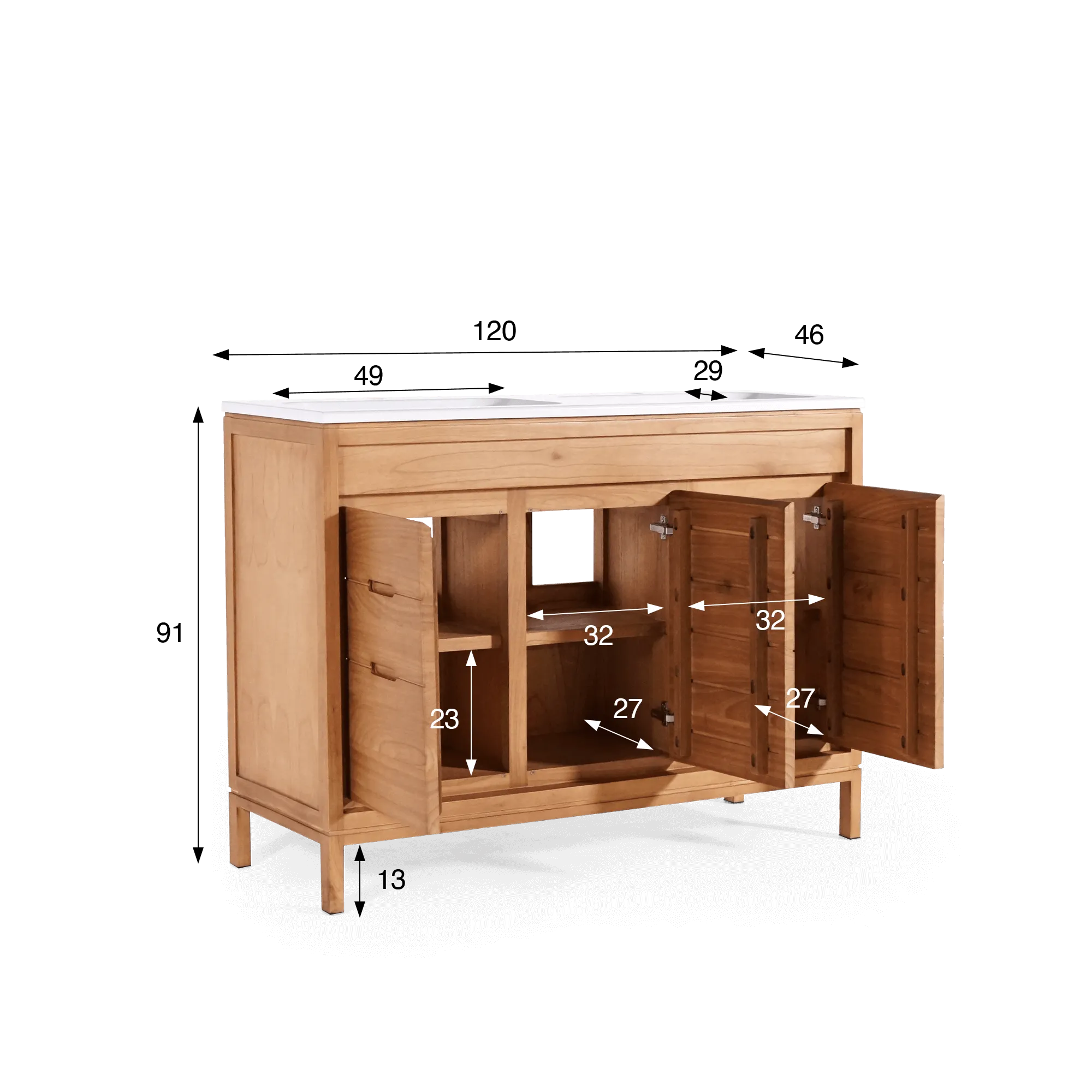 Avec sa largeur généreuse de 120 cm, le meuble de salle de bain double vasque en bois massif, blanc mat, Ashwini offre un confort d’utilisation idéal à deux, tout en conservant des proportions harmonieuses. Derrière ses trois portes battantes, l’aménagement intérieur a été pensé pour simplifier le quotidien : des compartiments spacieux permettent de ranger linge, produits et accessoires, avec une profondeur confortable de 27 cm. Les étagères intérieures, positionnées à une hauteur de 23 cm, facilitent l’organisation sans contraindre les volumes. L’espace central prévoit également le passage des arrivées d’eau, pour une installation fluide et sans compromis esthétique.