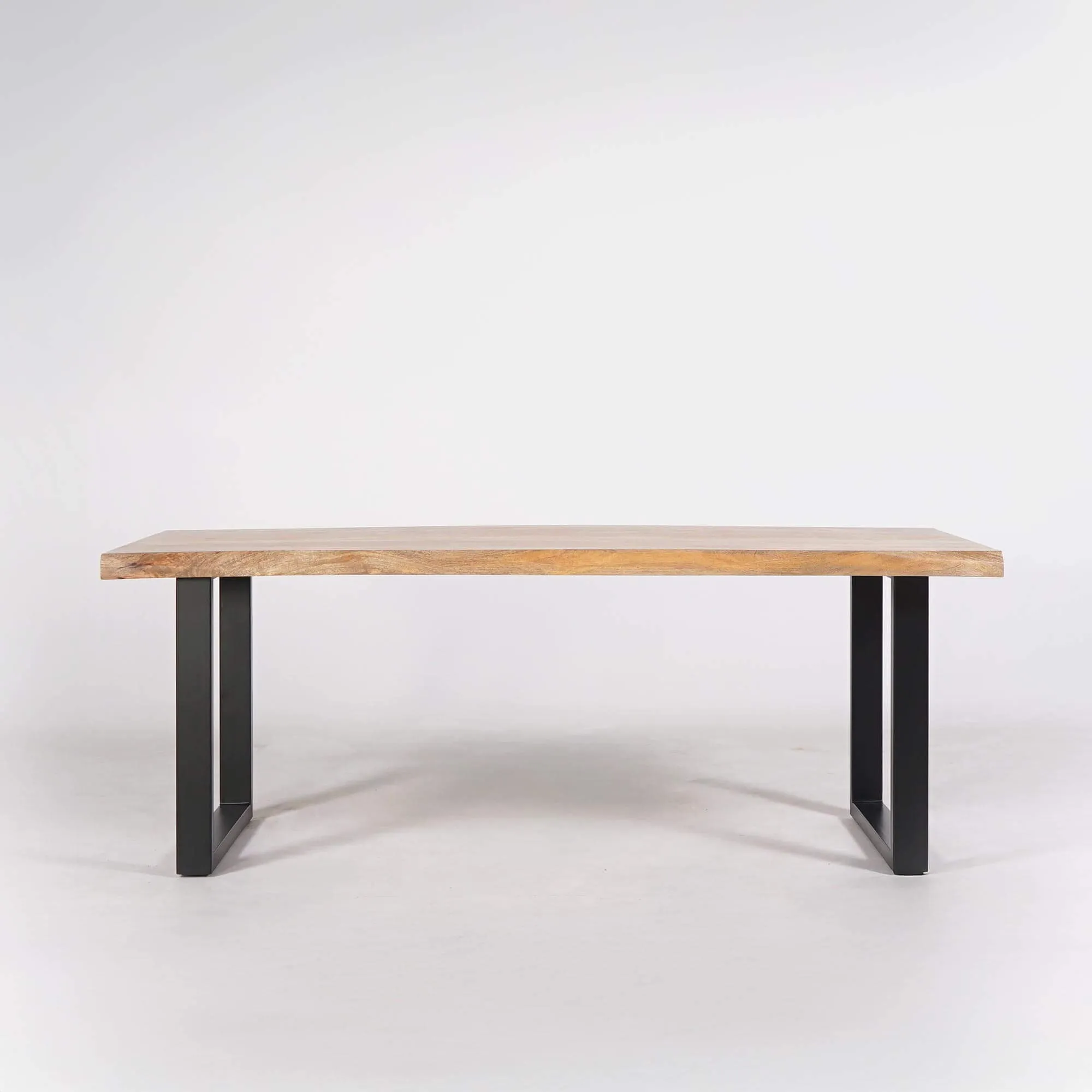 Ce qui distingue cette table, ce sont ses pieds en métal noir qui forment un U sobre et fonctionnel. Non seulement ils ajoutent une touche contemporaine, mais ils confèrent également à la table une stabilité remarquable. Le bois massif de manguier est le protagoniste ici, offrant une surface solide et résistante prête à résister aux défis du quotidien.