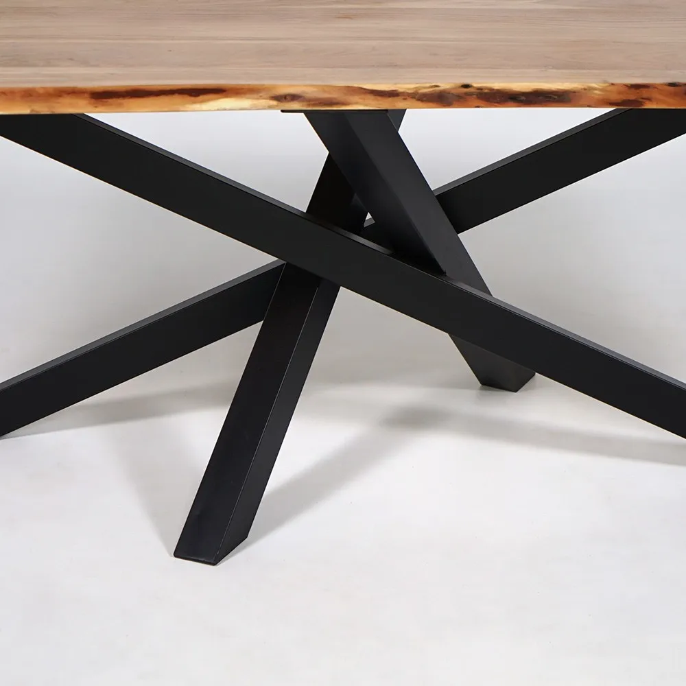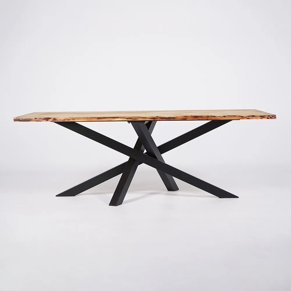 Table de salle à manger en bois massif à pied mikado en métal et bords naturels 200 cm