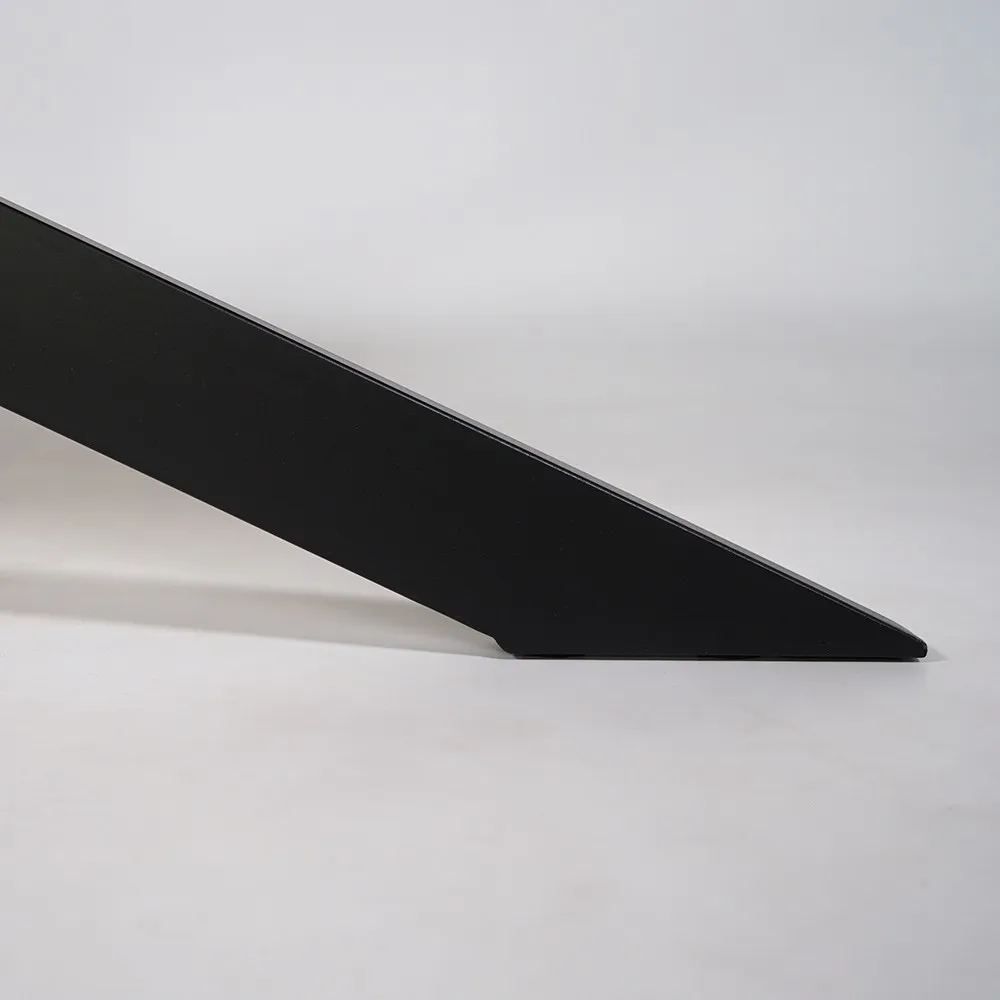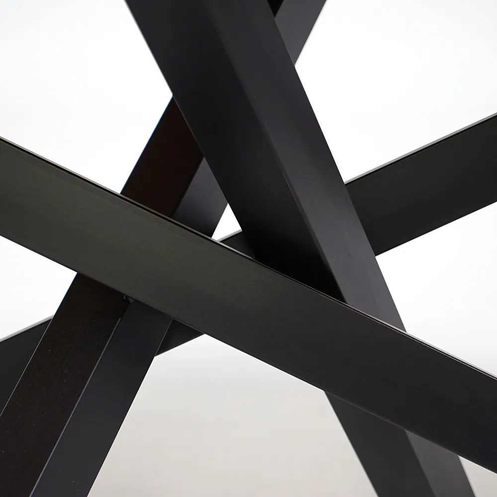 Le piètement en métal noir constitue l’élément signature de cette création. Inspiré du jeu de mikado, il se compose de plusieurs branches métalliques qui s’entrecroisent avec précision pour former une structure stable et expressive. La conception de cet entrelacement a demandé un véritable travail d’ingénierie afin de garantir à la fois solidité, équilibre et légèreté visuelle. Ce contraste entre la chaleur du bois et la rigueur du métal crée une silhouette forte qui s’intègre aussi bien dans un intérieur contemporain que dans une ambiance plus industrielle.