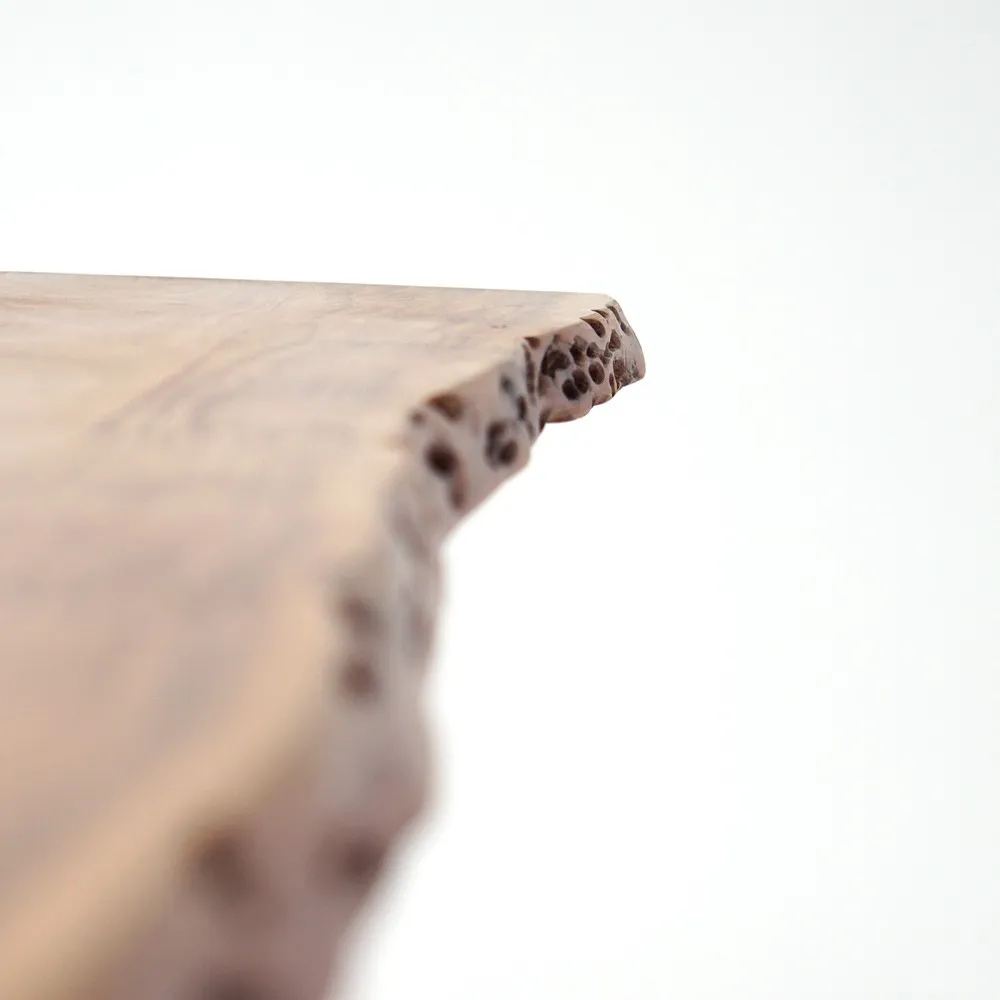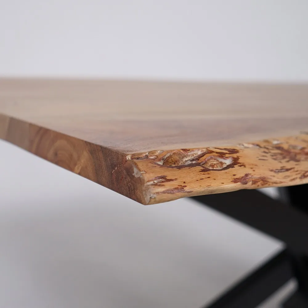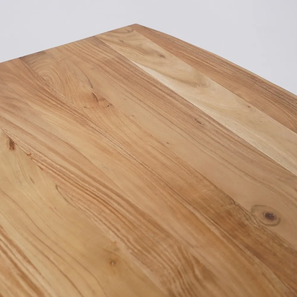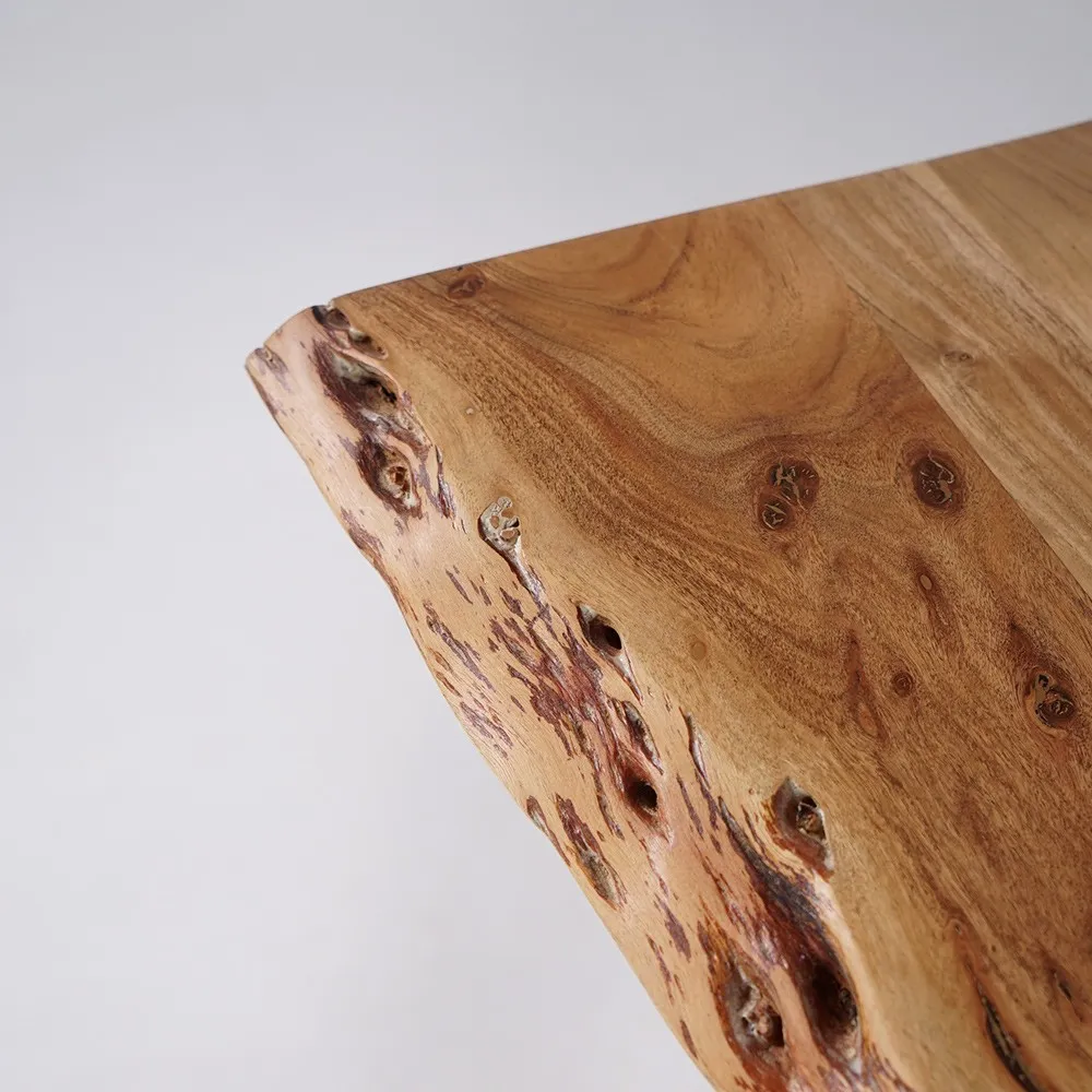 Le plateau, réalisé en bois massif d’acacia, révèle immédiatement le caractère vivant de cette essence. Chaque planche dévoile ses nuances naturelles, ses veines chaleureuses et ses variations de teinte qui donnent à la surface une profondeur unique. Nous avons choisi de conserver des bords naturels sur toute la longueur du plateau afin de préserver l’esprit originel du bois. Ces lignes irrégulières rappellent la forme de l’arbre dont il est issu et apportent une présence authentique à l’ensemble.