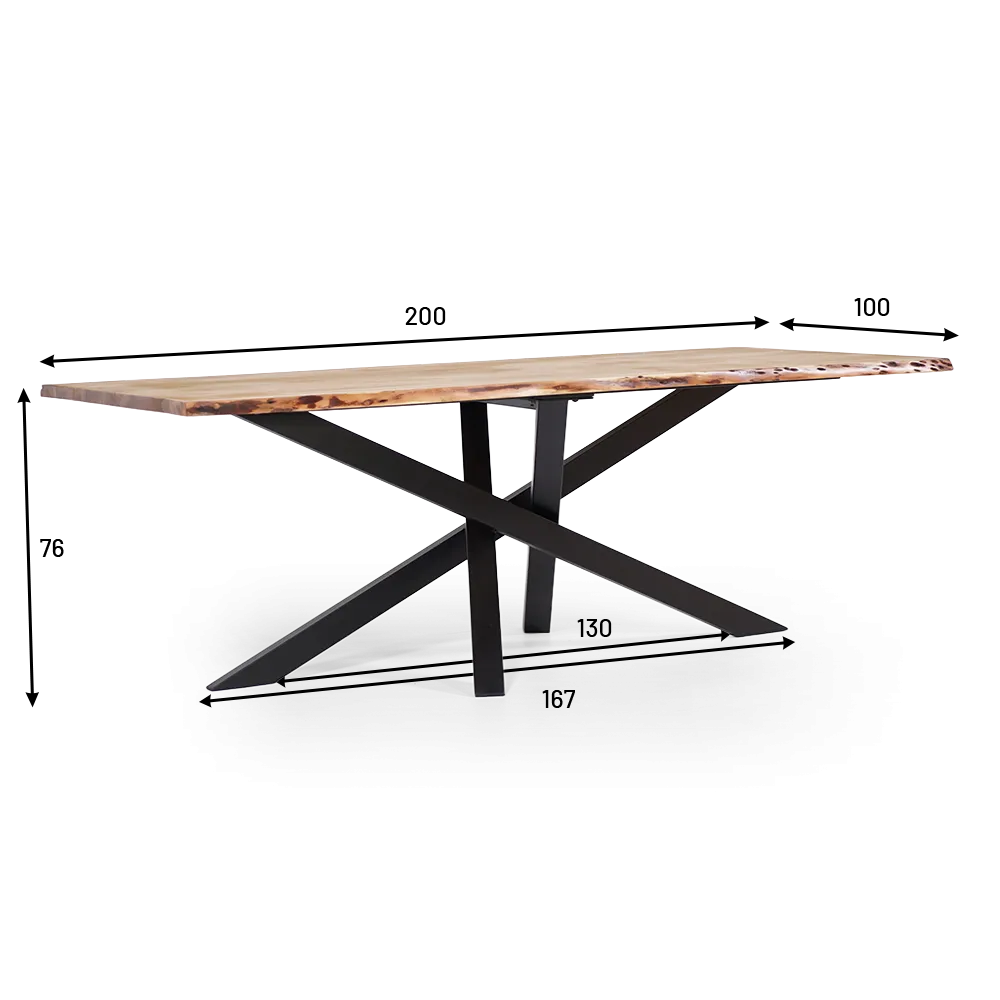 Table de salle à manger en bois massif à pied mikado en métal et bords naturels 200 cm 200 x 100 x 76 cm