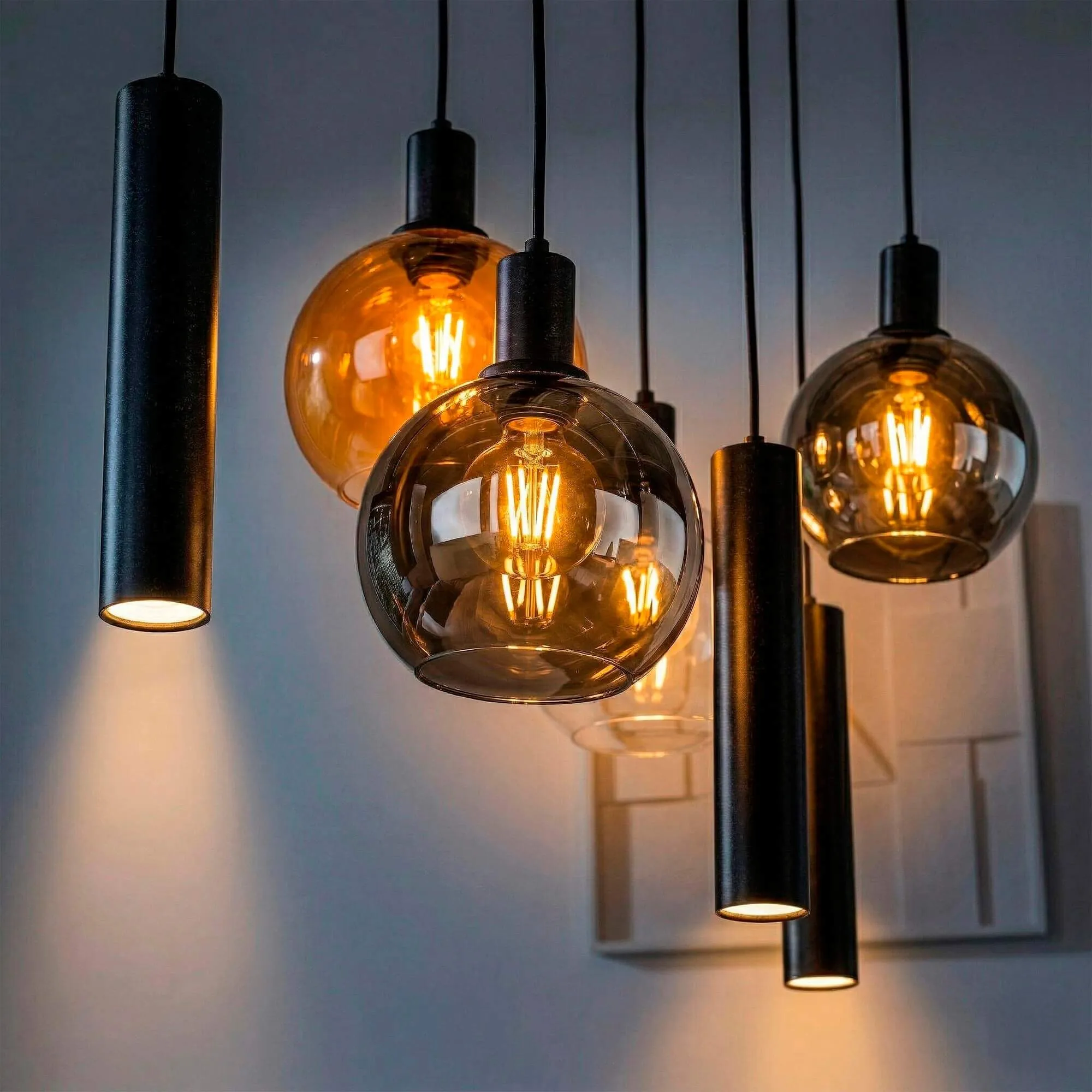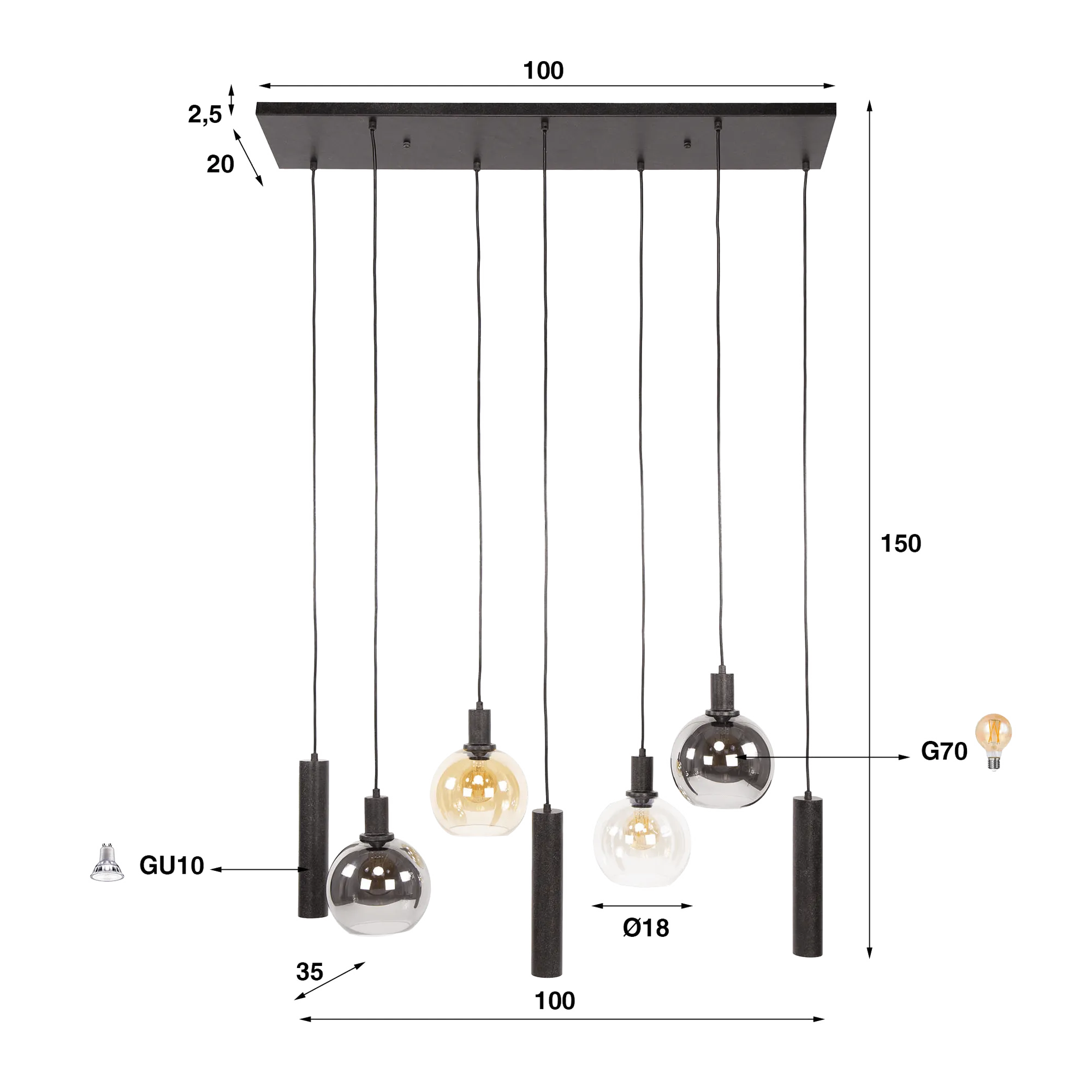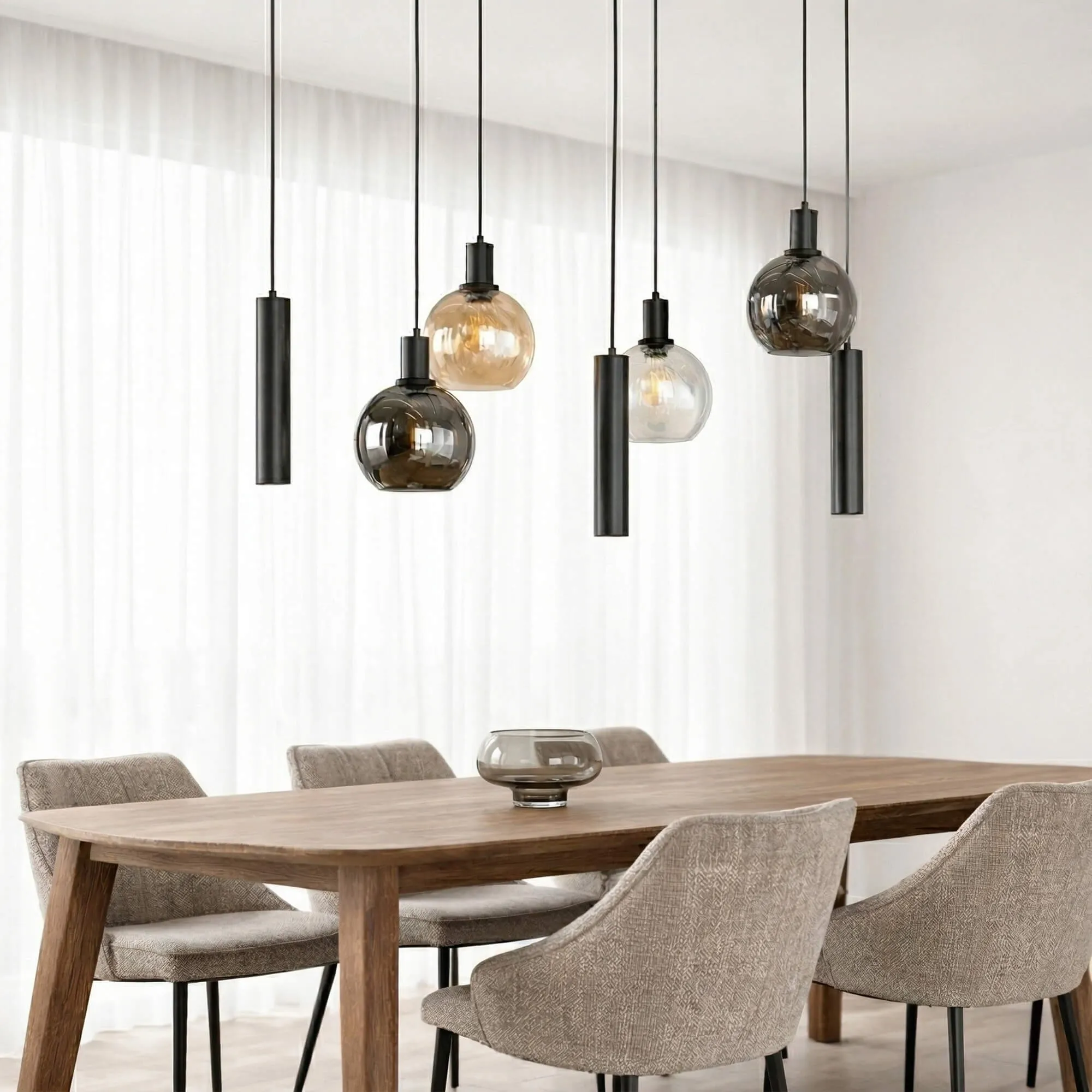 La structure horizontale de 100 cm de ce luminaire en suspension avec abat-jour en verre et métal noir permet d’accompagner élégamment une table à manger ou un îlot central, tandis que la hauteur maximale de 150 cm offre une grande liberté d’installation. Chaque diffuseur sphérique d’environ 18 cm de diamètre accueille une ampoule G70 (non incluse) qui met en valeur la profondeur du verre travaillé artisanalement. Les cylindres en métal noir, quant à eux, accueillent des sources GU10 (non incluses), diffusant un éclairage plus ciblé qui souligne la matière et crée un contraste harmonieux entre lumière d’ambiance et lumière fonctionnelle.
