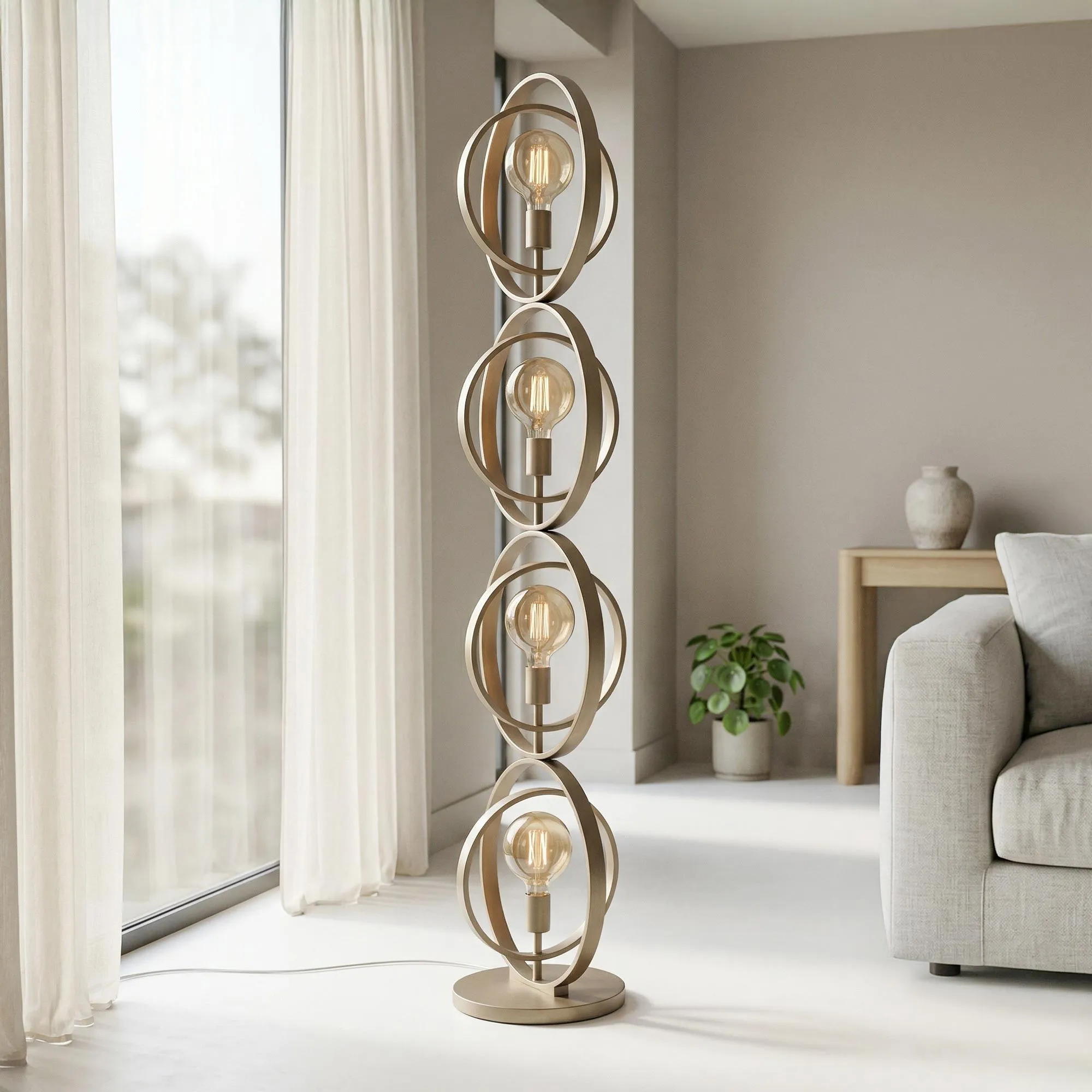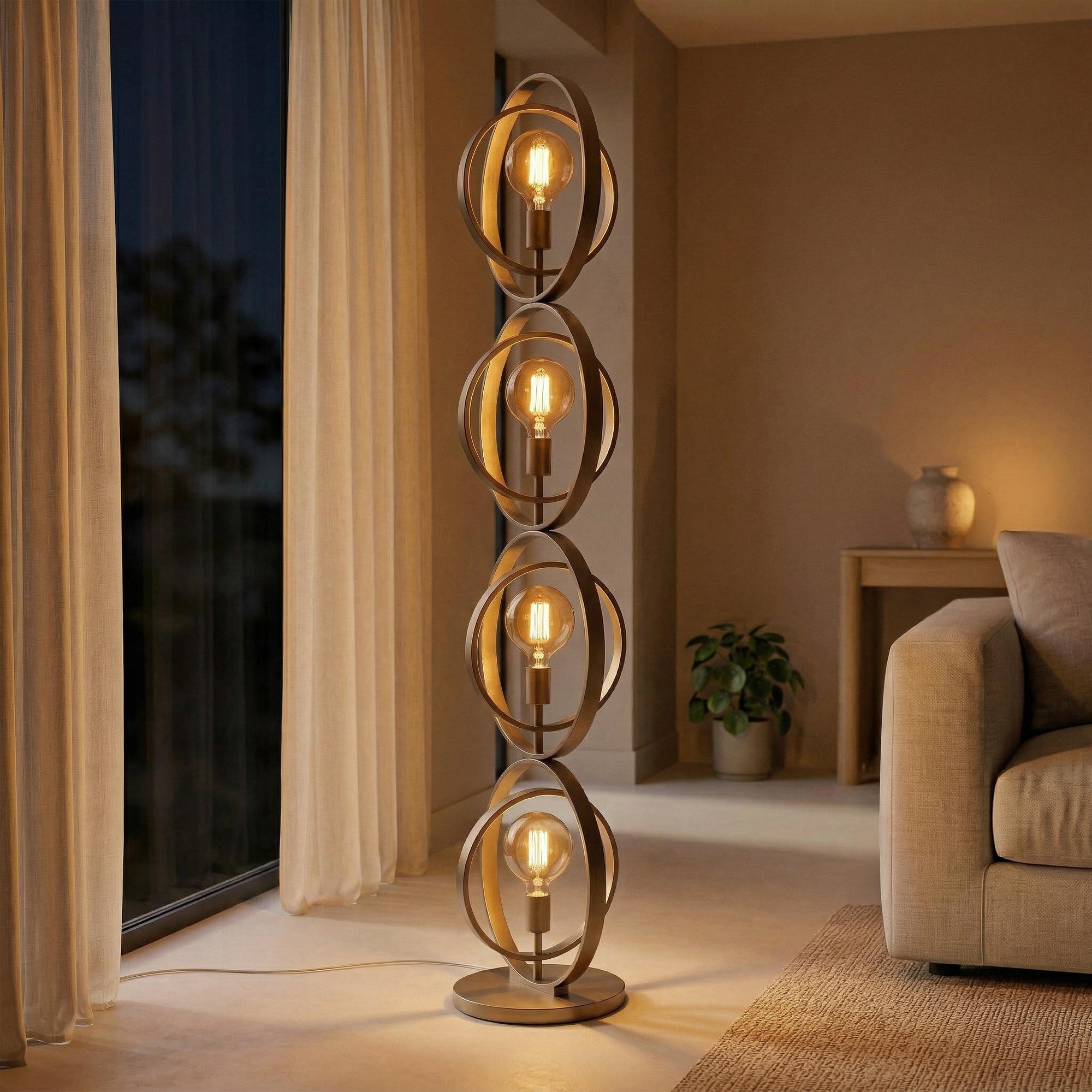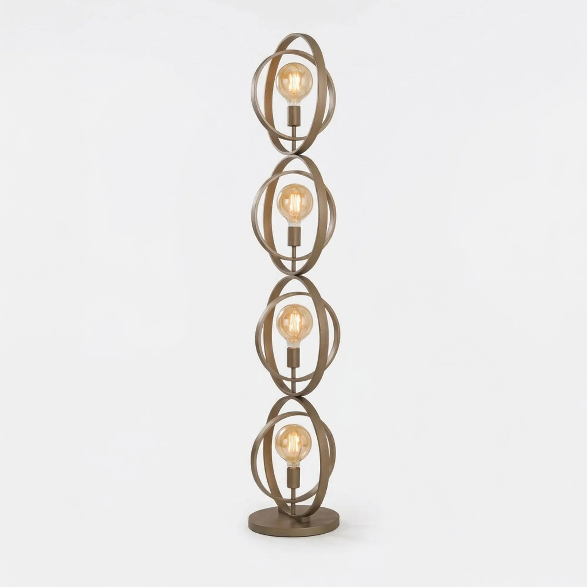 Pour concevoir le lampadaire de salon industriel en métal Altis, nous avons souhaité explorer l’équilibre entre structure et légèreté, en nous inspirant du mouvement silencieux des astres. Nos designers ont imaginé une composition verticale rythmée par quatre cercles métalliques, comme une succession d’orbites qui semblent organiser la lumière avec douceur. Cette construction graphique confère au lampadaire de salon industriel en métal Altis une présence affirmée tout en conservant une grande finesse visuelle.