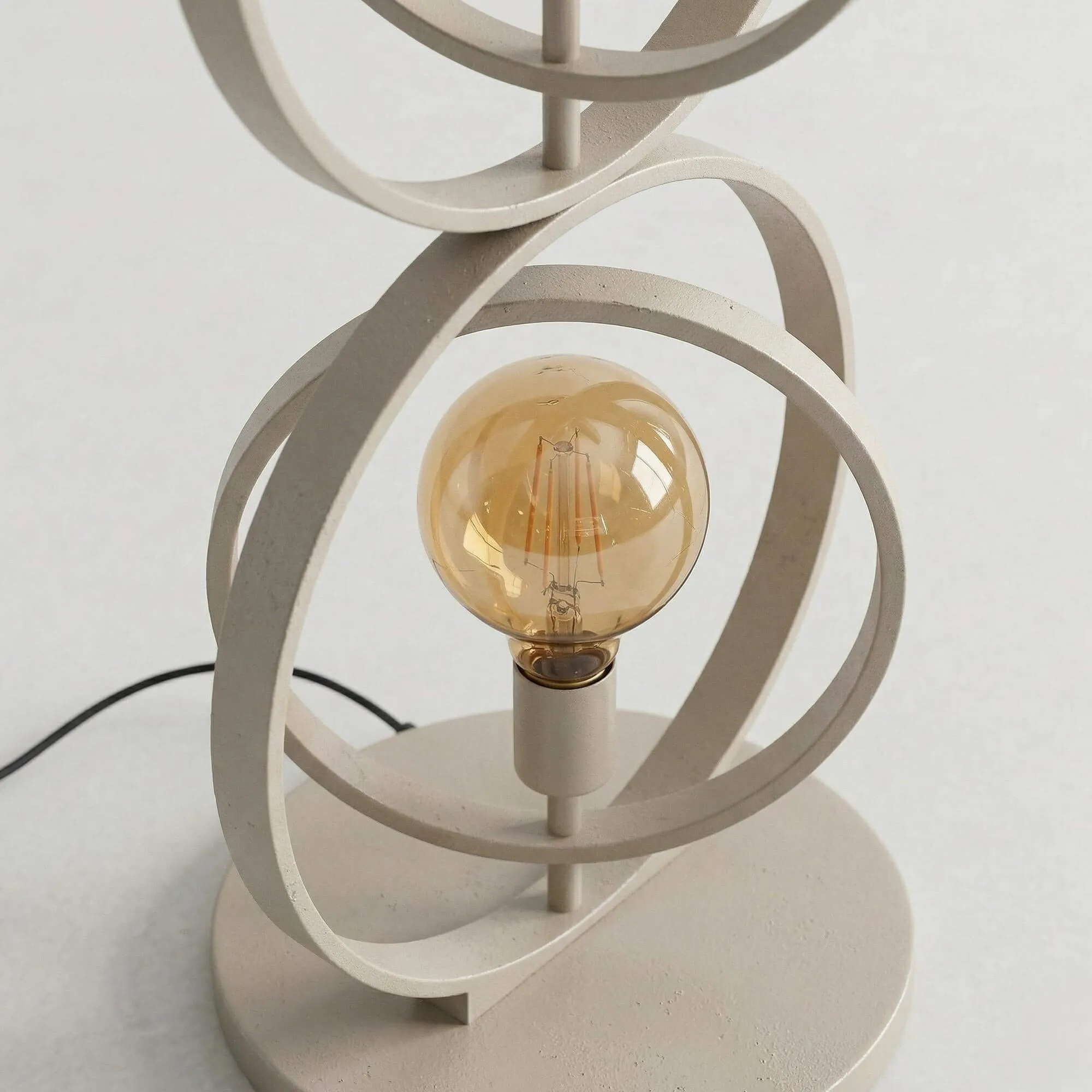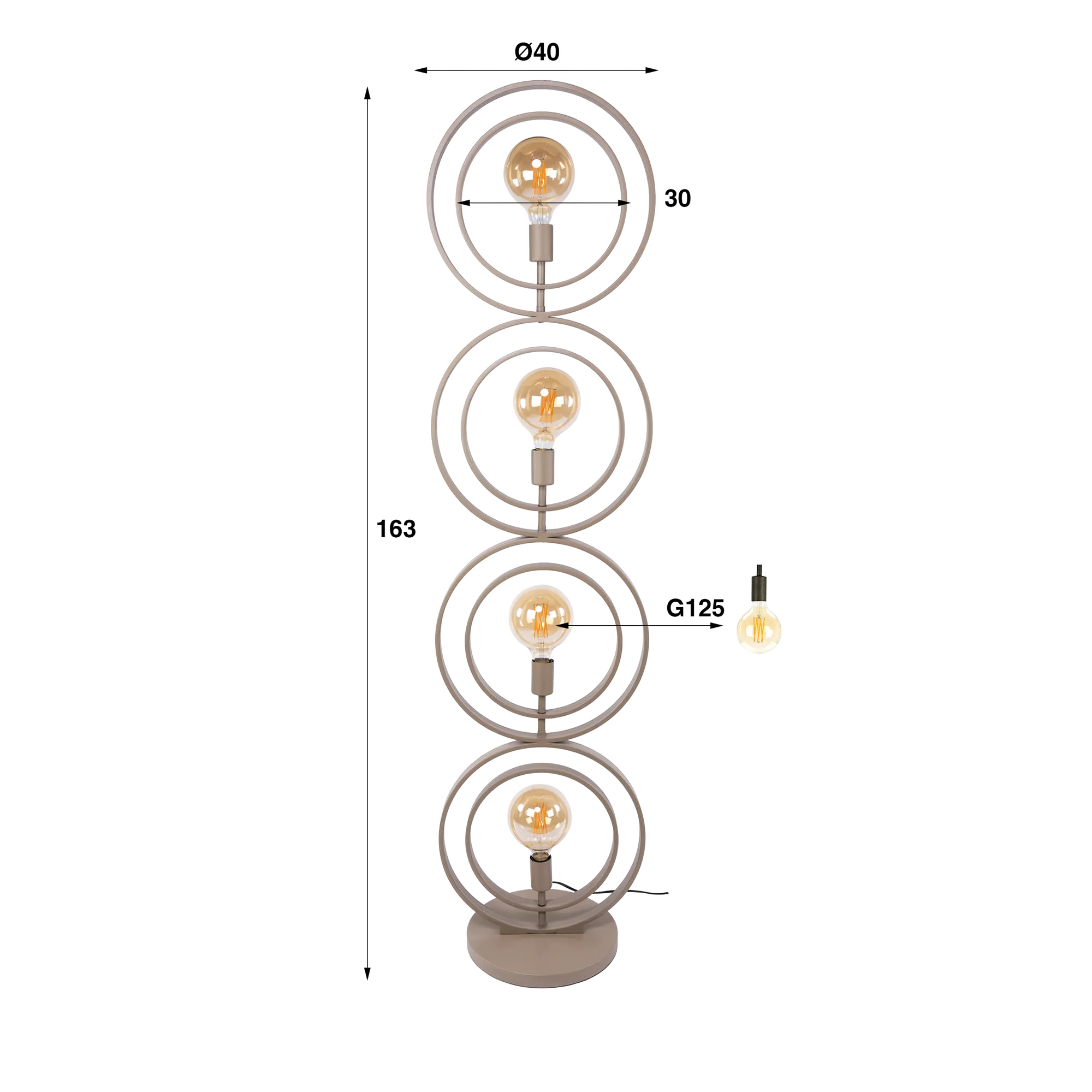 La silhouette élancée, d’environ 163 cm de hauteur pour 40 cm de diamètre, s’intègre naturellement dans un salon ou un espace de lecture. Les anneaux mobiles permettent de moduler subtilement l’orientation des formes, créant un jeu de perspectives qui évolue selon votre aménagement. Chaque source lumineuse accueille une ampoule G125 (non incluse), dont la lumière chaleureuse met en valeur la profondeur de la finition noir ou beige, révélant les nuances du métal travaillé avec précision.