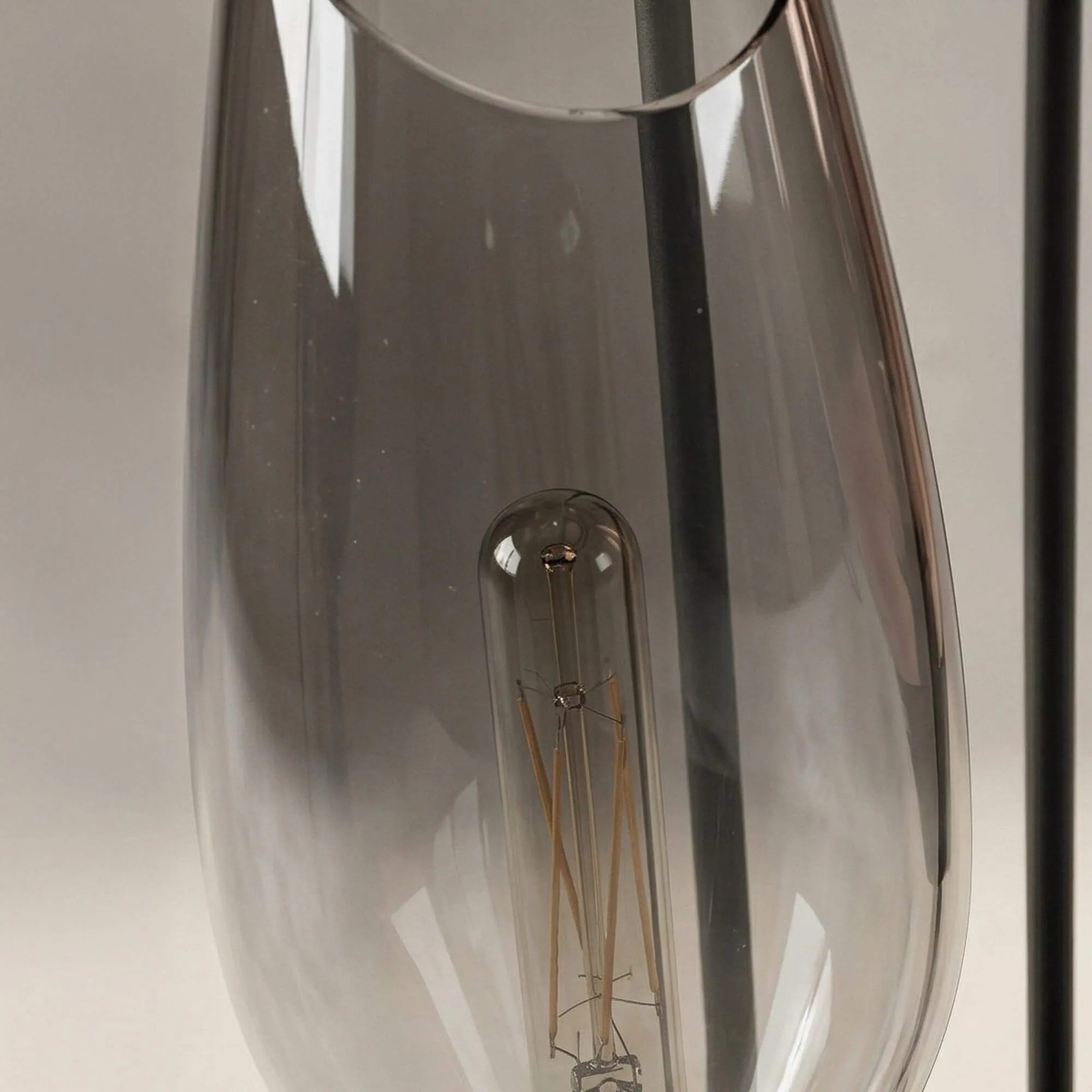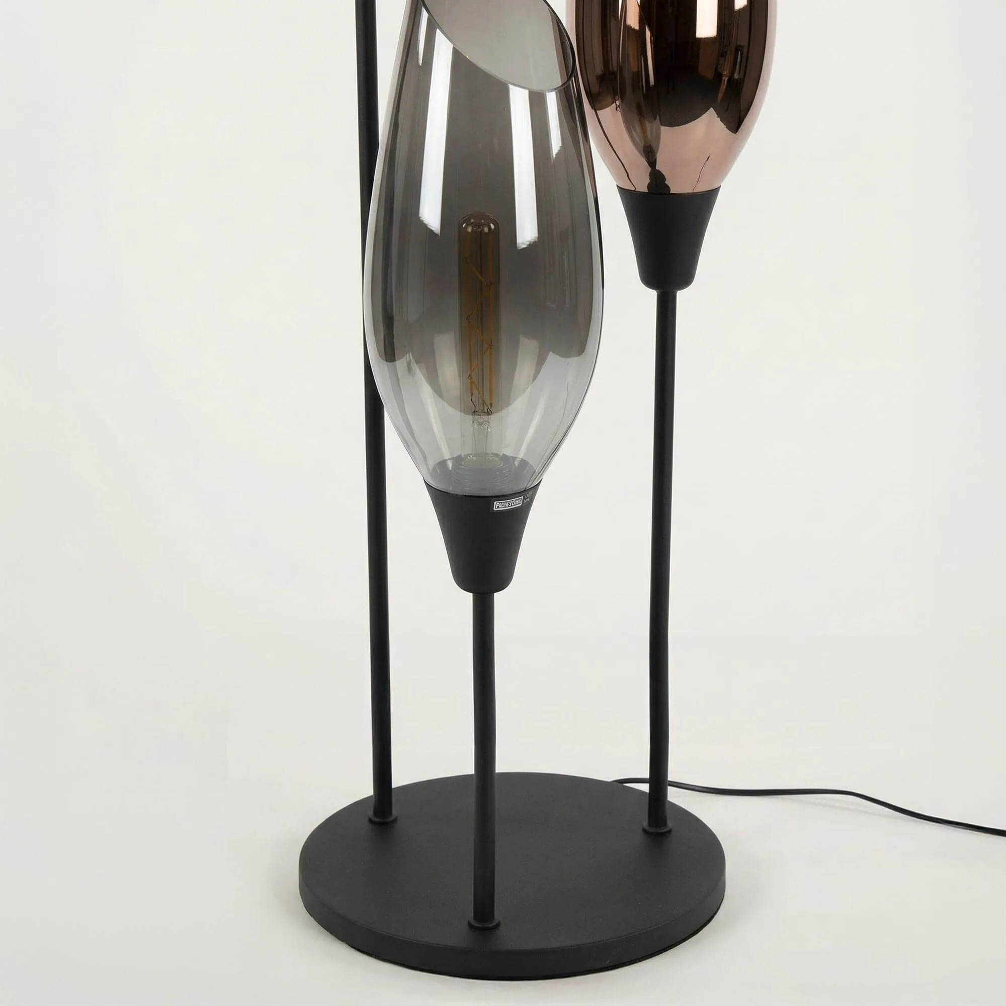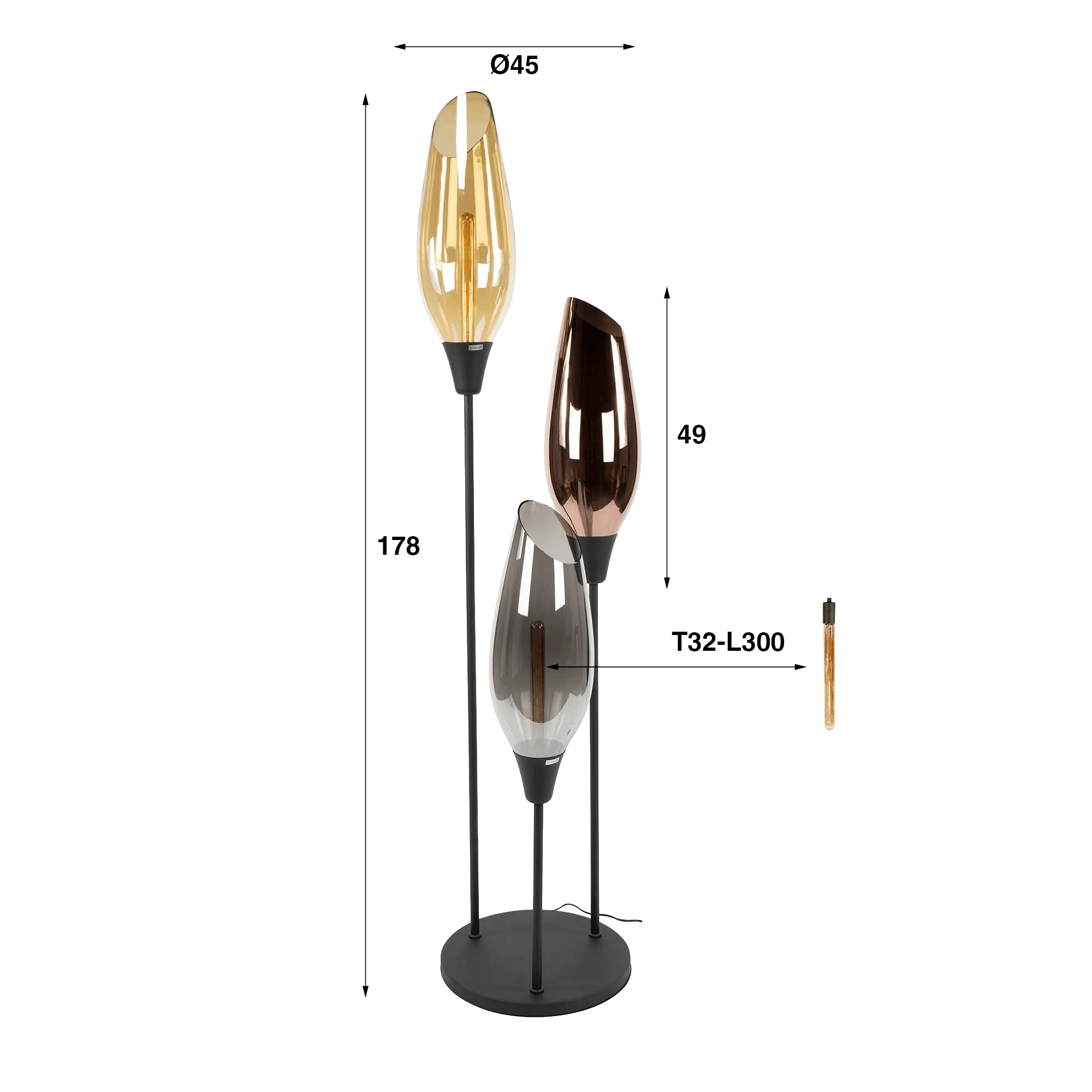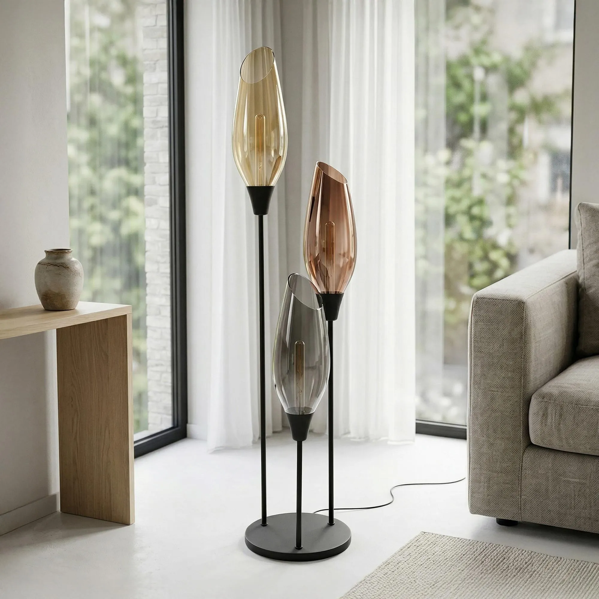 La structure de ce lampadaire design avec abat-jour en verre ambré XL, en métal noir, fine et équilibrée, repose sur une base ronde de 45 cm de diamètre assurant une stabilité discrète. L’ensemble atteint une hauteur de 178 cm, permettant au luminaire de trouver naturellement sa place près d’un canapé au salon ou dans un angle de pièce, où il accompagne les moments de détente sans encombrer l’espace. Les abat-jour en verre soufflé à la main, d’environ 49 cm de hauteur, révèlent la source lumineuse avec subtilité et laissent apparaître le filament des ampoules T32-L300 (non incluses), créant un jeu de transparence délicat entre les teintes ambrées, fumées et légèrement dorées.
