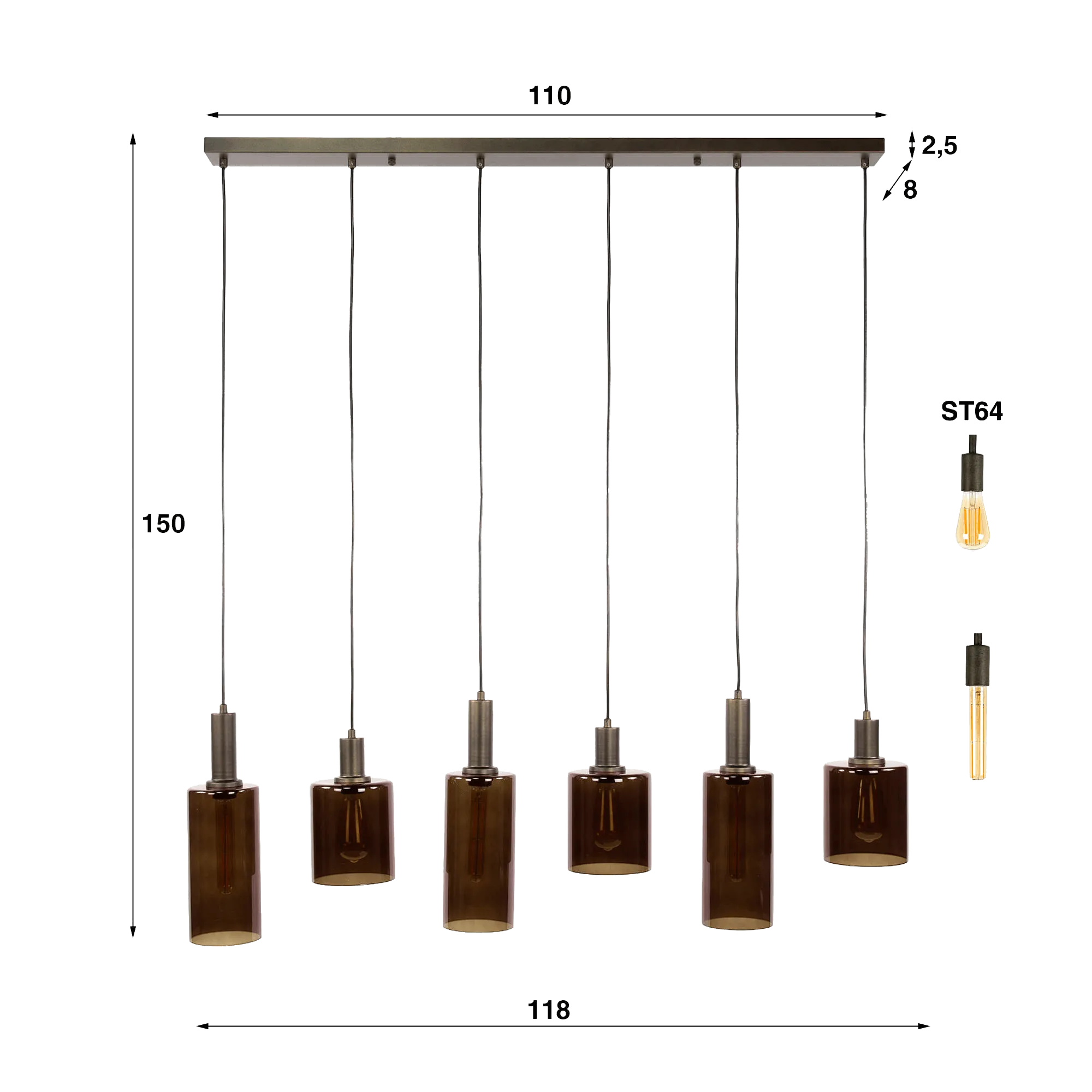 La structure en métal brun de ce luminaire en suspension en métal et verre fumé apporte une présence discrète et équilibrée, soulignant la finesse des lignes verticales. Avec une longueur d’environ 110 cm et une hauteur ajustable par abat-jour jusqu’à 150 cm, cette suspension s’intègre naturellement au-dessus d’une table de salle à manger, d’un îlot central ou d'une table de réunion dans un bureau, créant un point de lumière structurant sans surcharger l’espace. L’alignement des six suspensions permet une diffusion homogène de la lumière, idéale pour accompagner les moments de partage ou sublimer un espace de travail convivial.