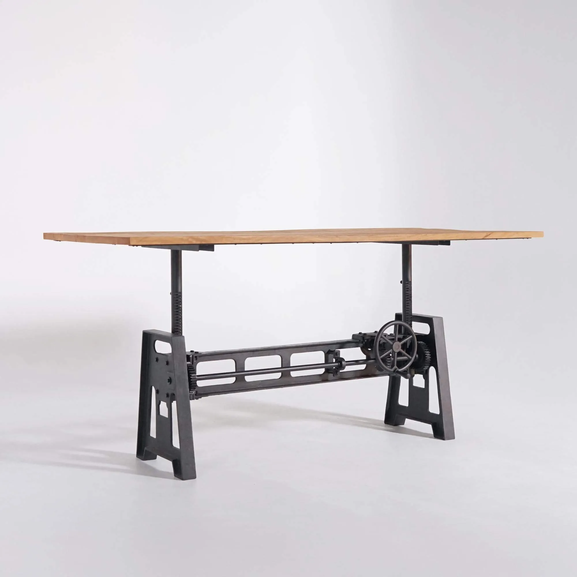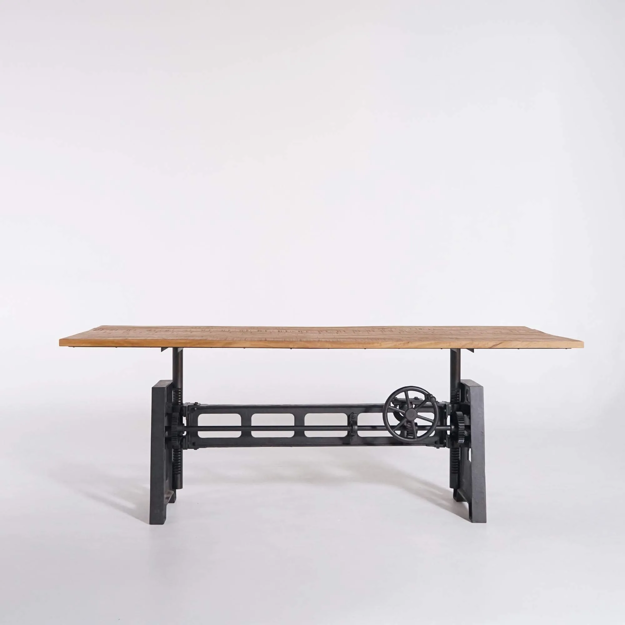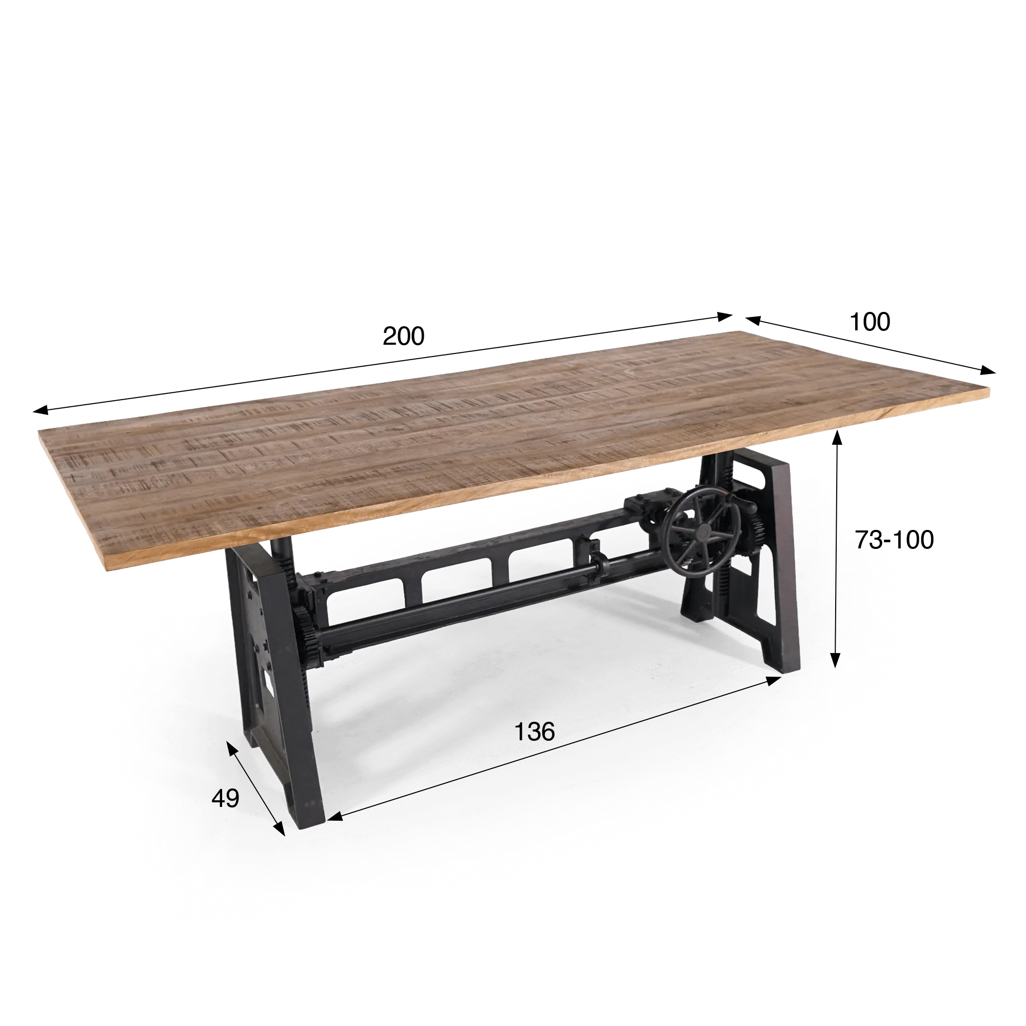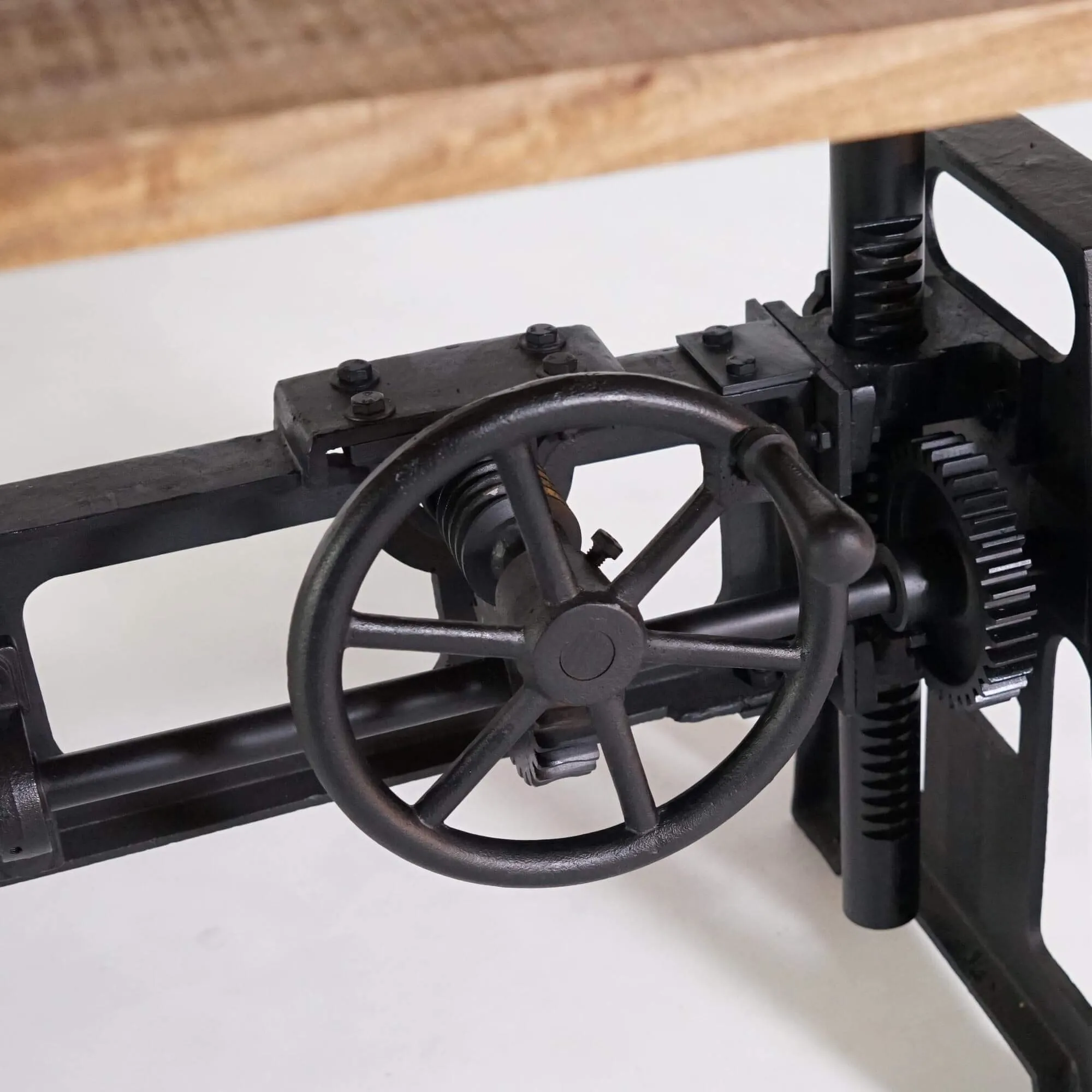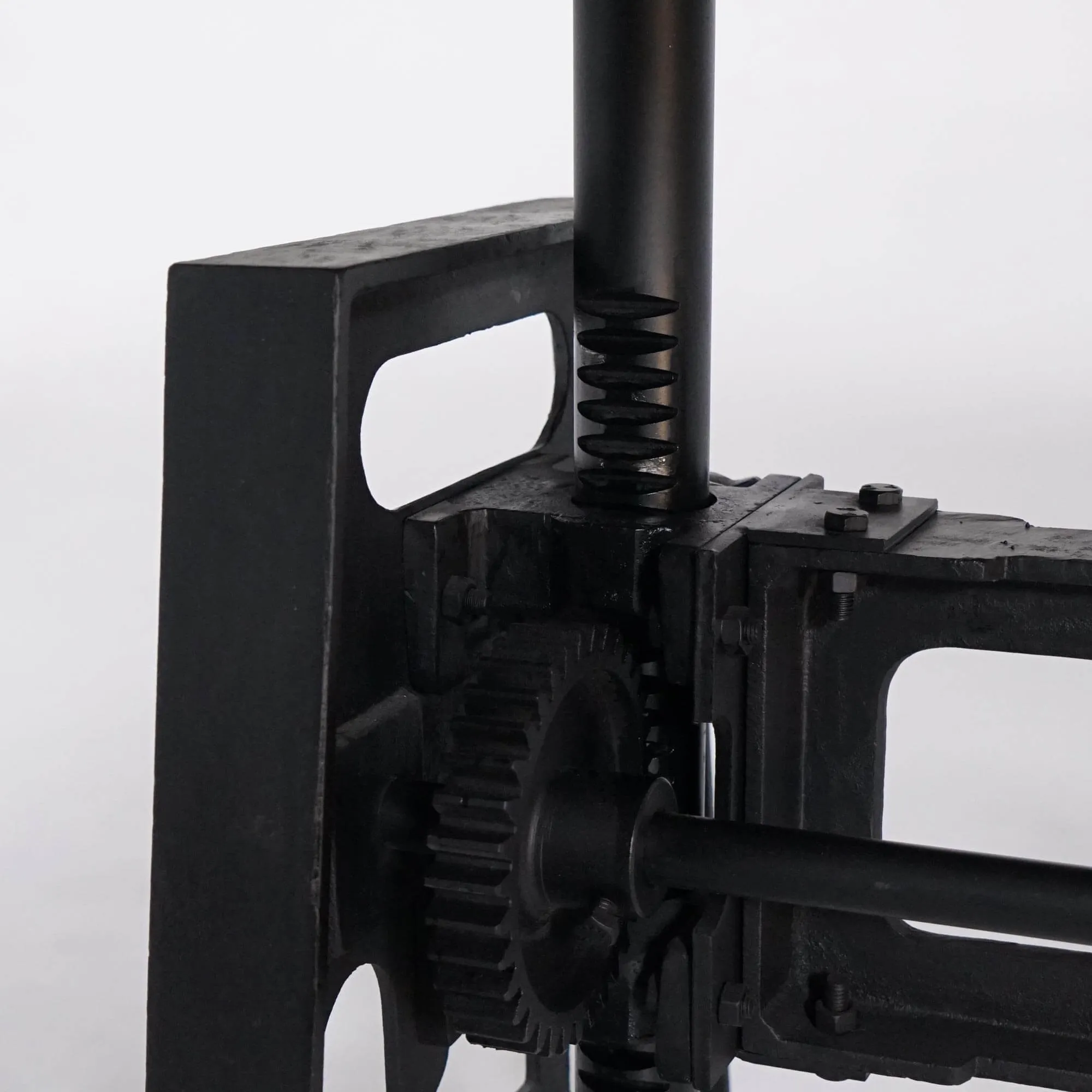 La manivelle entraine un pas de vis et permet d'ajuster la hauteur de la table de 75 cm à plus de 100 cm de hauteur. Le pied est entièrement réalisé en fonte. Certaines pièces proviennent du recyclage industriel, d’autres sont moulées et façonnées à la main pour votre plus grand plaisir. La structure en métal noir est brute et donne un aspect vintage à la table.